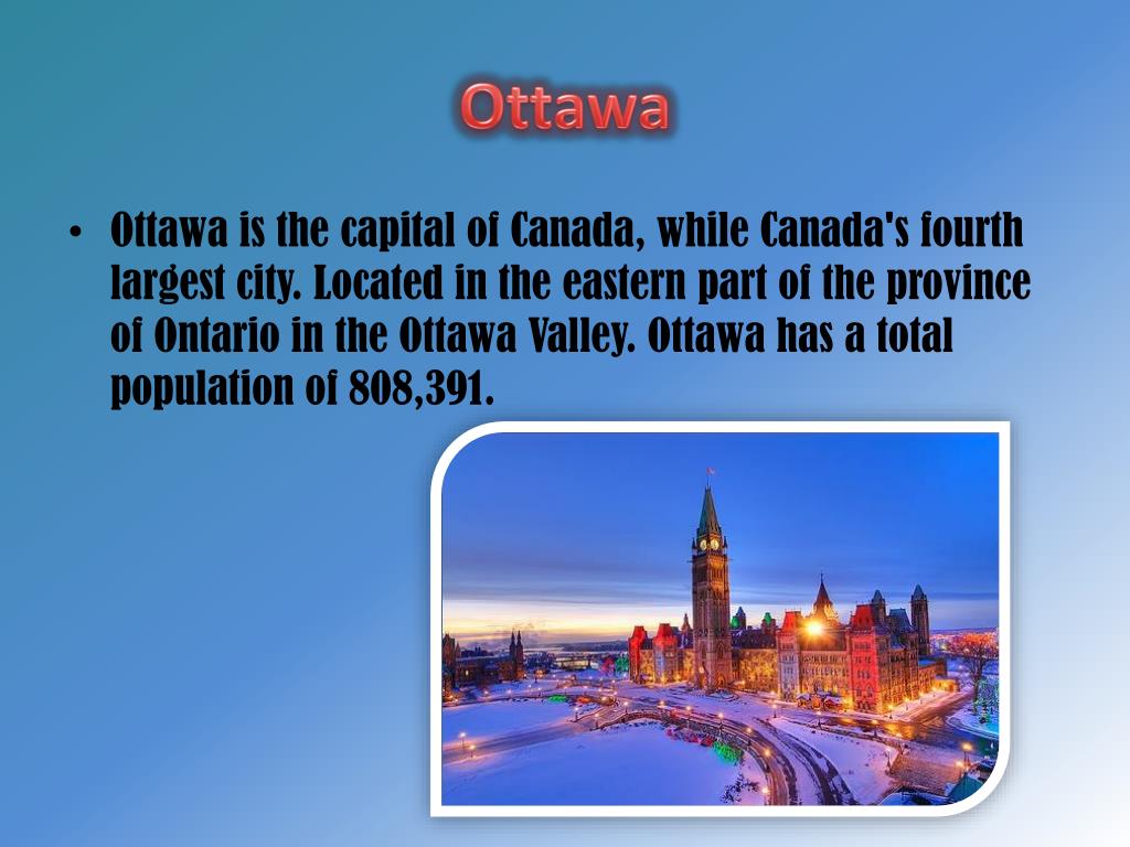 Ottawa • Ottawa is the capital of Canada, while Canada's fourth largest city. Located in the eastern part of the province of Ontario in the Ottawa Valley. Ottawa has a total population of 808,391.