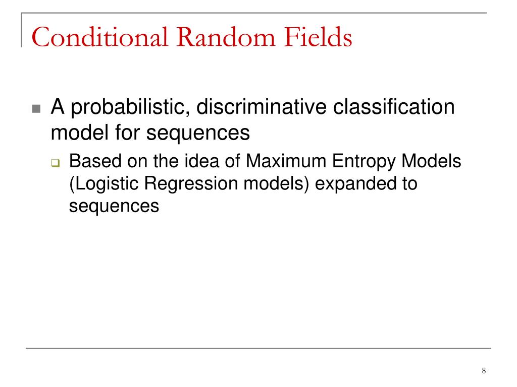 Conditional Random Fields • A probabilistic, discriminative classification model for sequences • Based on the idea of Maximum Entropy Models (Logistic Regression models) expanded to sequences