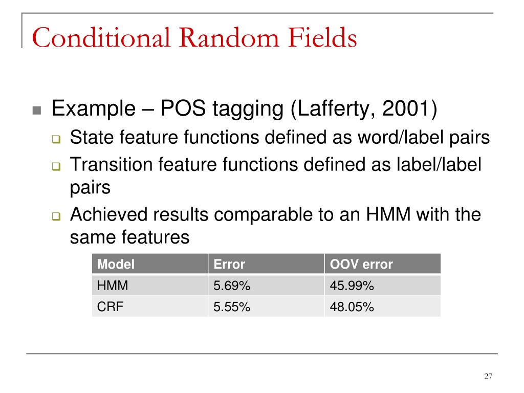Conditional Random Fields • Example – POS tagging (Lafferty, 2001) • State feature functions defined as word/label pairs • Transition feature functions defined as label/label pairs • Achieved results comparable to an HMM with the same features