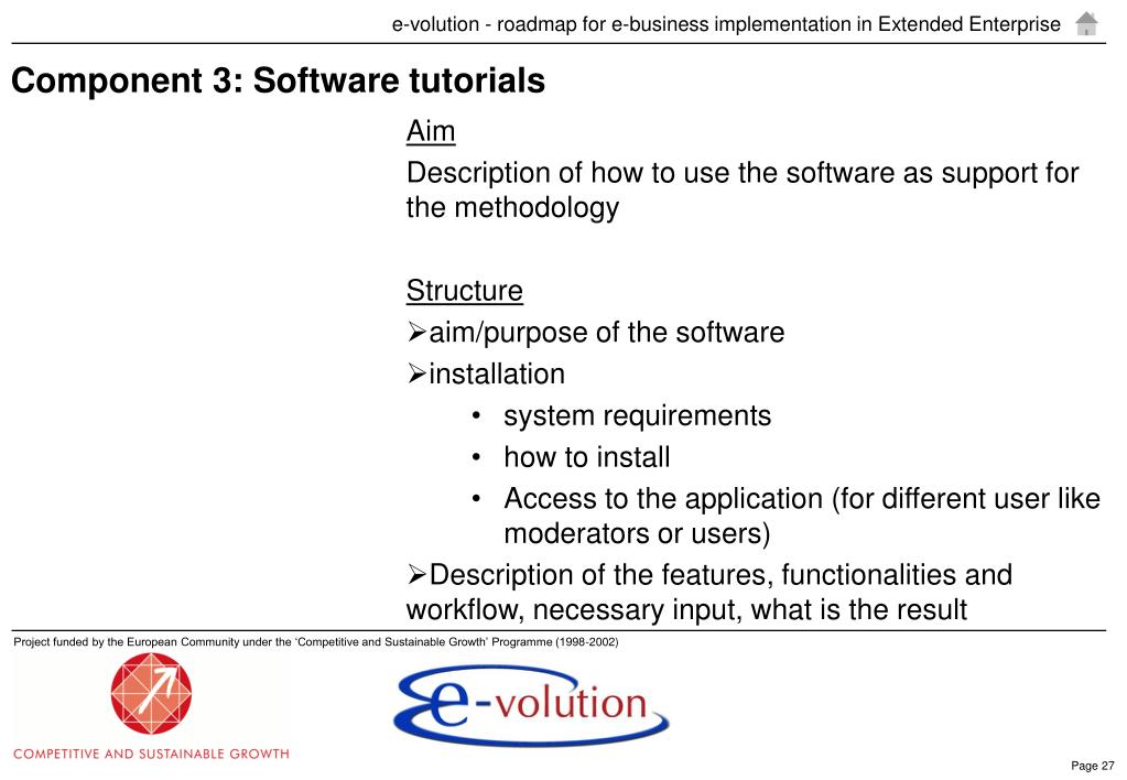 Component 3: Software tutorials • Aim • Description of how to use the software as support for the methodology • Structure • aim/purpose of the software • installation • system requirements • how to install • Access to the application (for different user like moderators or users) • Description of the features, functionalities and workflow, necessary input, what is the result