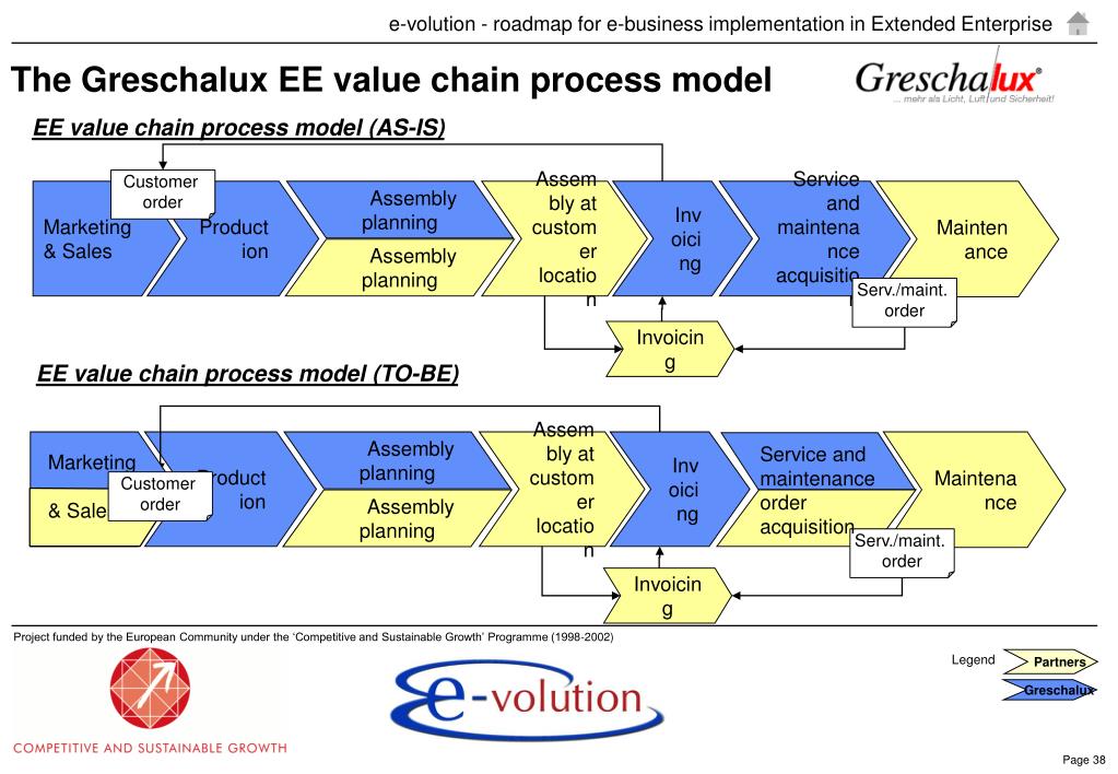 Legend Partners Greschalux The Greschalux EE value chain process model EE value chain process model (AS-IS) Customer order Marketing & Sales Production Assembly planning Assembly at customer location Invoicing Service and maintenance acquisition Maintenance Assembly planning Serv./maint. order Invoicing EE value chain process model (TO-BE) Production Assembly planning Assembly at customer location Invoicing Maintenance Service and maintenance order acquisition Marketing & Sales Customer order Assembly planning Serv./maint. order Invoicing