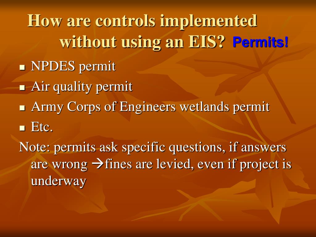 How are controls implemented without using an EIS? Permits! • NPDES permit • Air quality permit • Army Corps of Engineers wetlands permit • Etc. Note: permits ask specific questions, if answers are wrong fines are levied, even if project is underway