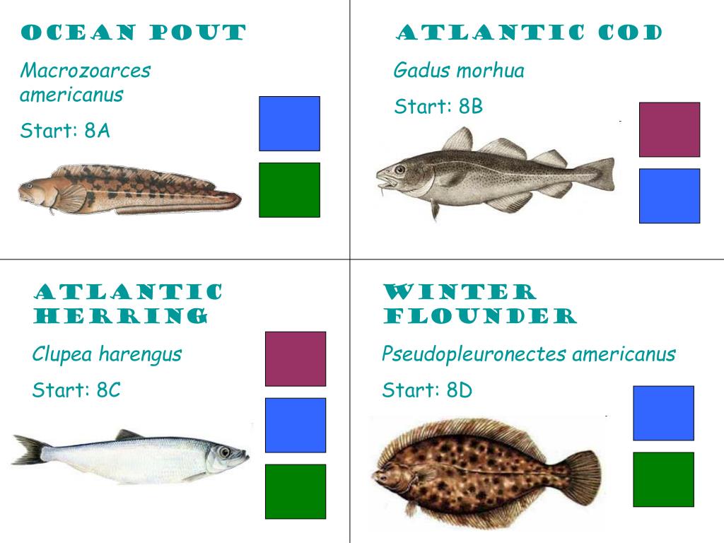 Ocean Pout Macrozoarces americanus Start: 8A Atlantic Cod Gadus morhua Start: 8B Atlantic Herring Clupea harengus Start: 8C Winter Flounder Pseudopleuronectes americanus Start: 8D
