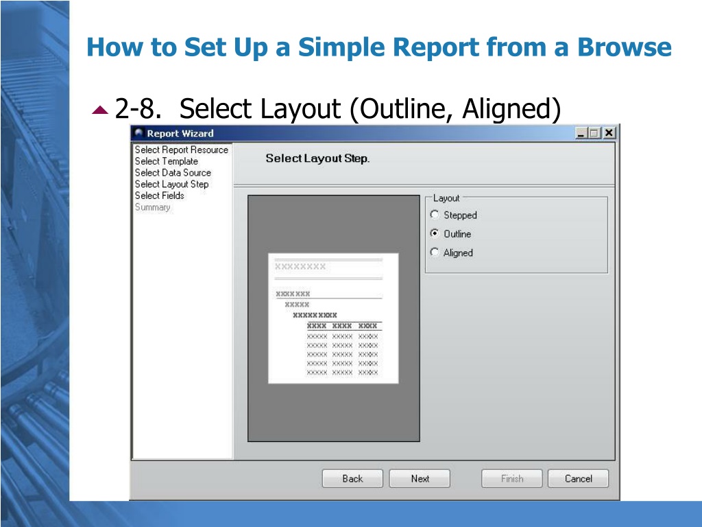 2-8. Select Layout (Outline, Aligned) How to Set Up a Simple Report from a Browse