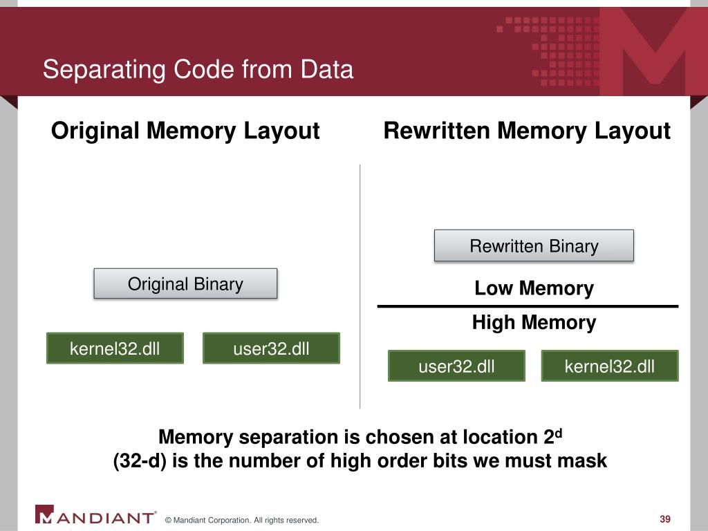 Separating Code from Data Rewritten Memory Layout Original Memory Layout Rewritten Binary Original Binary Low Memory High Memory kernel32.dll user32.dll user32.dll kernel32.dll Memory separation is chosen at location 2d (32-d) is the number of high order bits we must mask