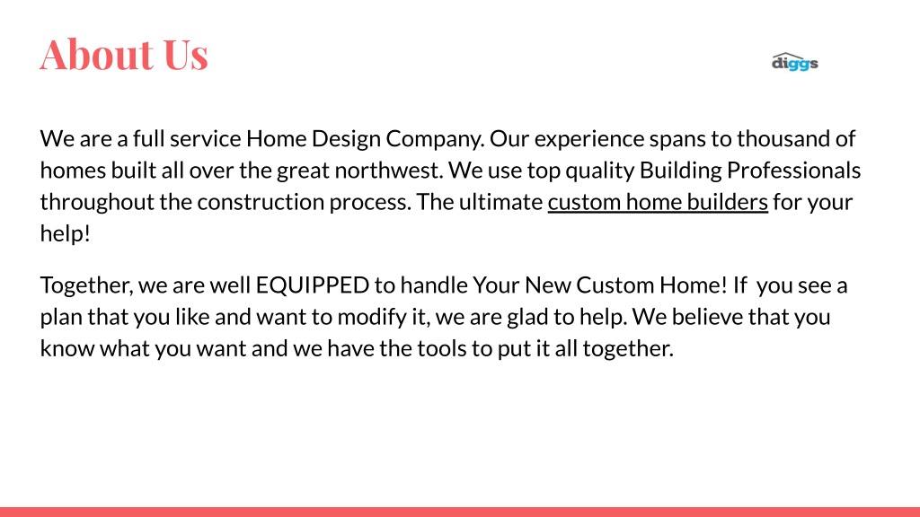 About Us We are a full service Home Design Company. Our experience spans to thousand of homes built all over the great northwest. We use top quality Building Professionals throughout the construction process. The ultimate custom home builders for your help! Together, we are well EQUIPPED to handle Your New Custom Home! If you see a plan that you like and want to modify it, we are glad to help. We believe that you know what you want and we have the tools to put it all together.