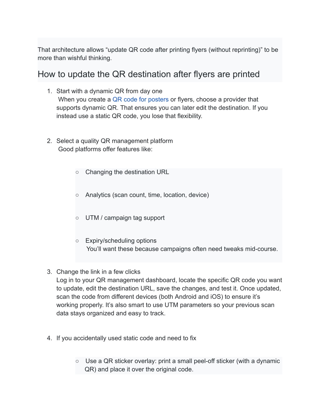 That architecture allows “update QR code after printing flyers (without reprinting)” to be more than wishful thinking. How to update the QR destination after flyers are printed 1. Start with a dynamic QR from day one When you create a QR code for posters or flyers, choose a provider that supports dynamic QR. That ensures you can later edit the destination. If you instead use a static QR code, you lose that flexibility. 2. Select a quality QR management platform Good platforms offer features like: ○Changing the destination URL ○Analytics (scan count, time, location, device) ○UTM / campaign tag support ○Expiry/scheduling options You’ll want these because campaigns often need tweaks mid-course. 3. Change the link in a few clicks Log in to your QR management dashboard, locate the specific QR code you want to update, edit the destination URL, save the changes, and test it. Once updated, scan the code from different devices (both Android and iOS) to ensure it’s working properly. It’s also smart to use UTM parameters so your previous scan data stays organized and easy to track. 4. If you accidentally used static code and need to fix ○Use a QR sticker overlay: print a small peel-off sticker (with a dynamic QR) and place it over the original code.