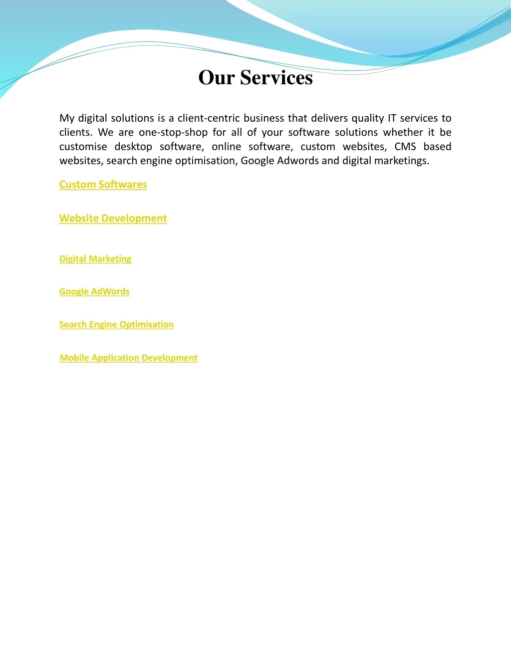 Our Services My digital solutions is a client-centric business that delivers quality IT services to clients. We are one-stop-shop for all of your software solutions whether it be customise desktop software, online software, custom websites, CMS based websites, search engine optimisation, Google Adwords and digital marketings. Custom Softwares Website Development Digital Marketing Google AdWords Search Engine Optimisation Mobile Application Development