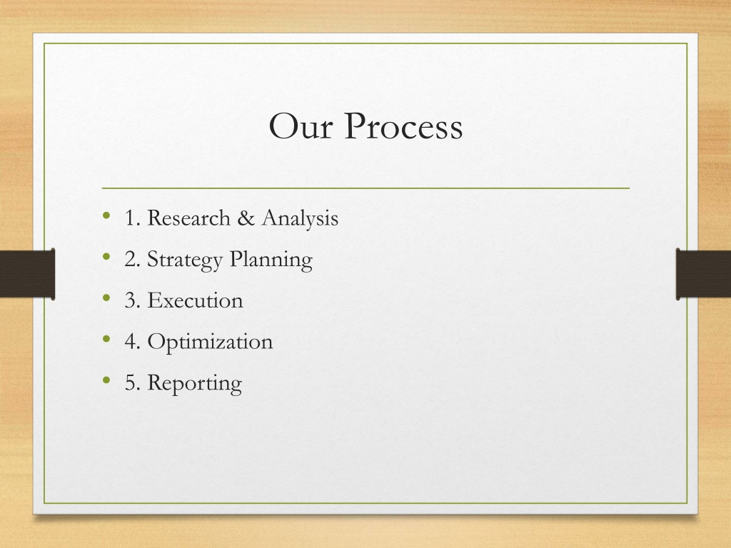 Our Process • 1. Research & Analysis • 2. Strategy Planning • 3. Execution • 4. Optimization • 5. Reporting
