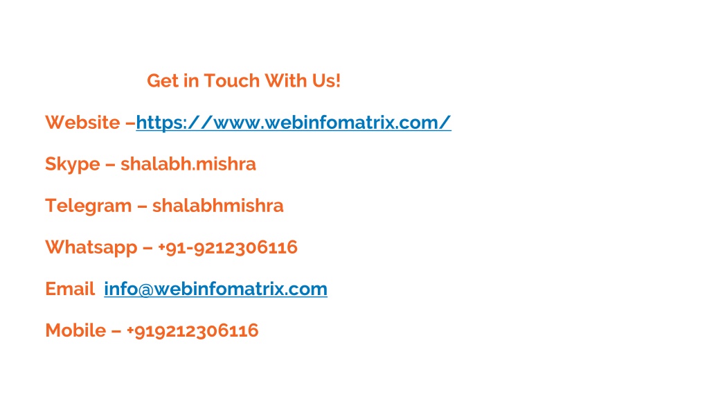 Get in Touch With Us! Website –https://www.webinfomatrix.com/ Skype – shalabh.mishra Telegram – shalabhmishra Whatsapp – +91-9212306116 Email info@webinfomatrix.com Mobile – +919212306116