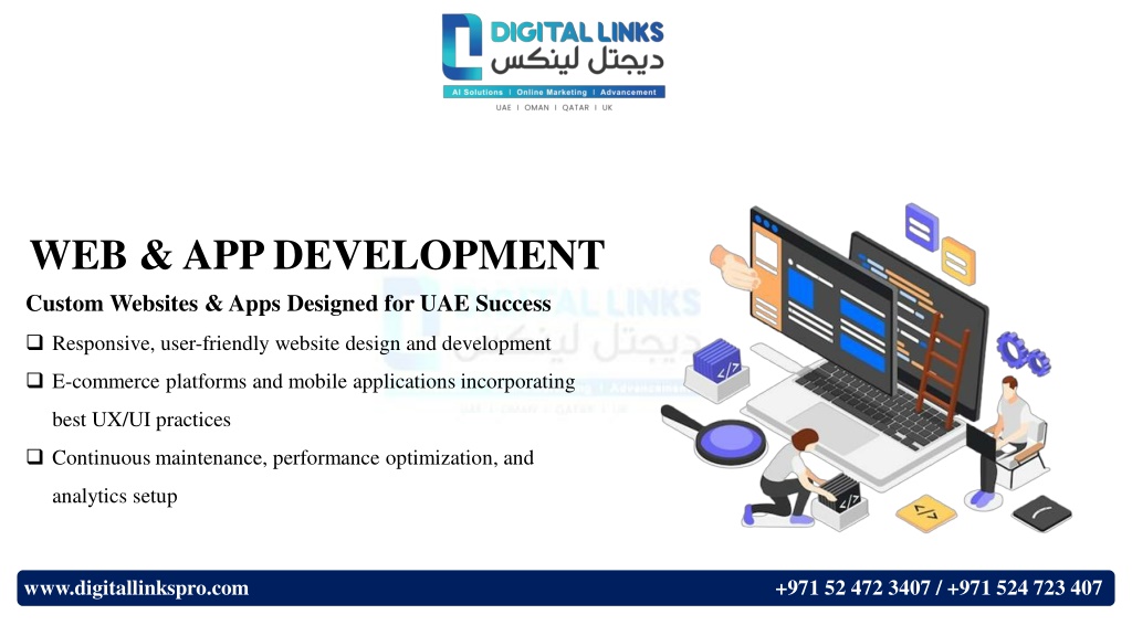 WEB & APP DEVELOPMENT Custom Websites & Apps Designed for UAE Success Responsive, user-friendly website design and development E-commerce platforms and mobile applications incorporating best UX/UI practices Continuous maintenance, performance optimization, and analytics setup www.digitallinkspro.com +971 52 472 3407 / +971 524 723 407
