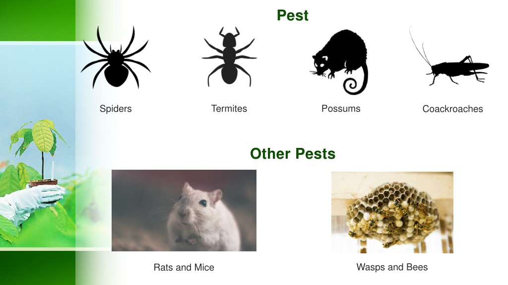 Pest Termites Possums Spiders Coackroaches Other Pests Wasps and Bees Rats and Mice