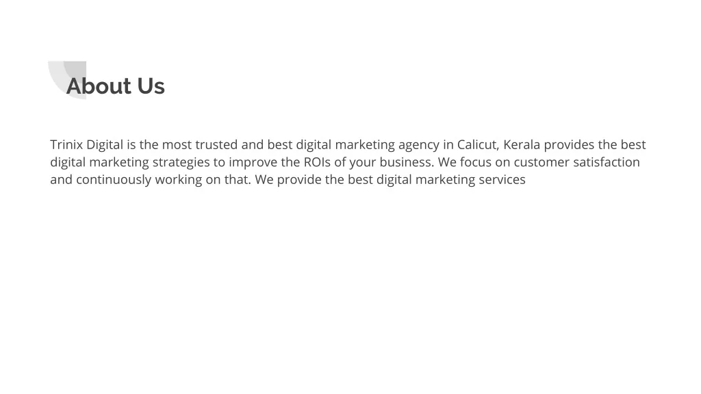 About Us Trinix Digital is the most trusted and best digital marketing agency in Calicut, Kerala provides the best digital marketing strategies to improve the ROIs of your business. We focus on customer satisfaction and continuously working on that. We provide the best digital marketing services