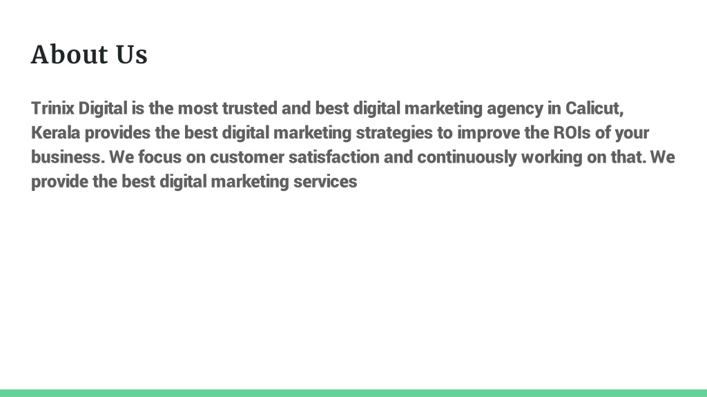 About Us Trinix Digital is the most trusted and best digital marketing agency in Calicut, Kerala provides the best digital marketing strategies to improve the ROIs of your business. We focus on customer satisfaction and continuously working on that. We provide the best digital marketing services