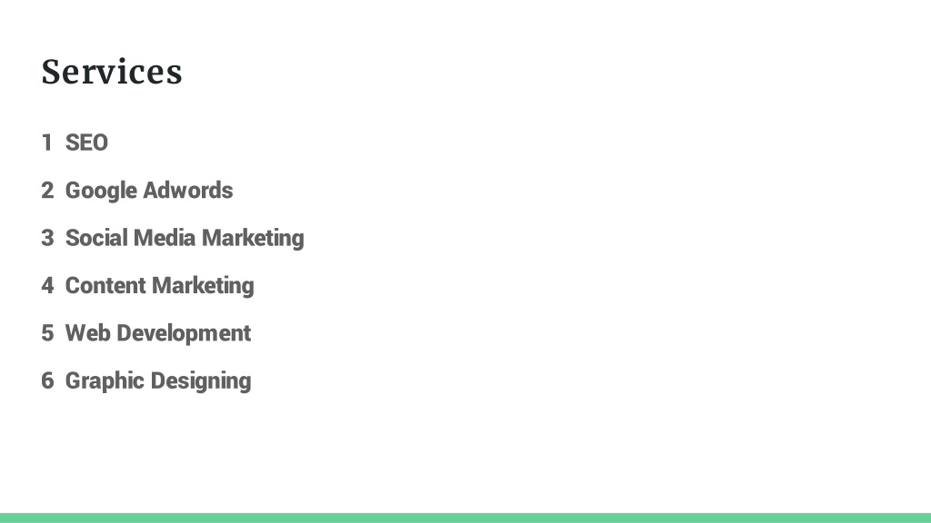 Services 1 SEO 2 Google Adwords 3 Social Media Marketing 4 Content Marketing 5 Web Development 6 Graphic Designing