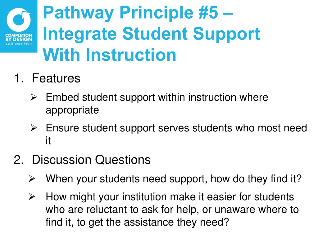Pathway Principle #5 – Integrate Student Support With Instruction • Features • Embed student support within instruction where appropriate • Ensure student support serves students who most need it • Discussion Questions • When your students need support, how do they find it? • How might your institution make it easier for students who are reluctant to ask for help, or unaware where to find it, to get the assistance they need?
