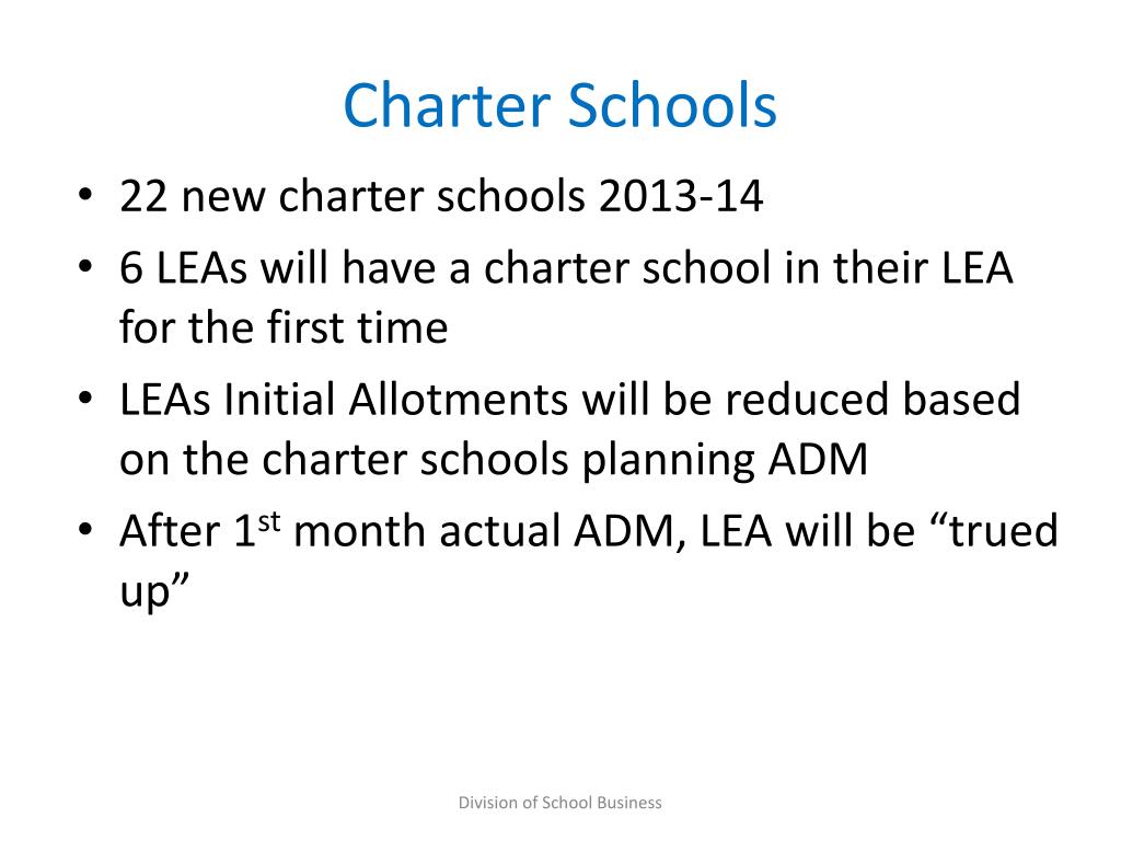 Charter Schools • 22 new charter schools 2013-14 • 6 LEAs will have a charter school in their LEA for the first time • LEAs Initial Allotments will be reduced based on the charter schools planning ADM • After 1st month actual ADM, LEA will be “trued up” Division of School Business