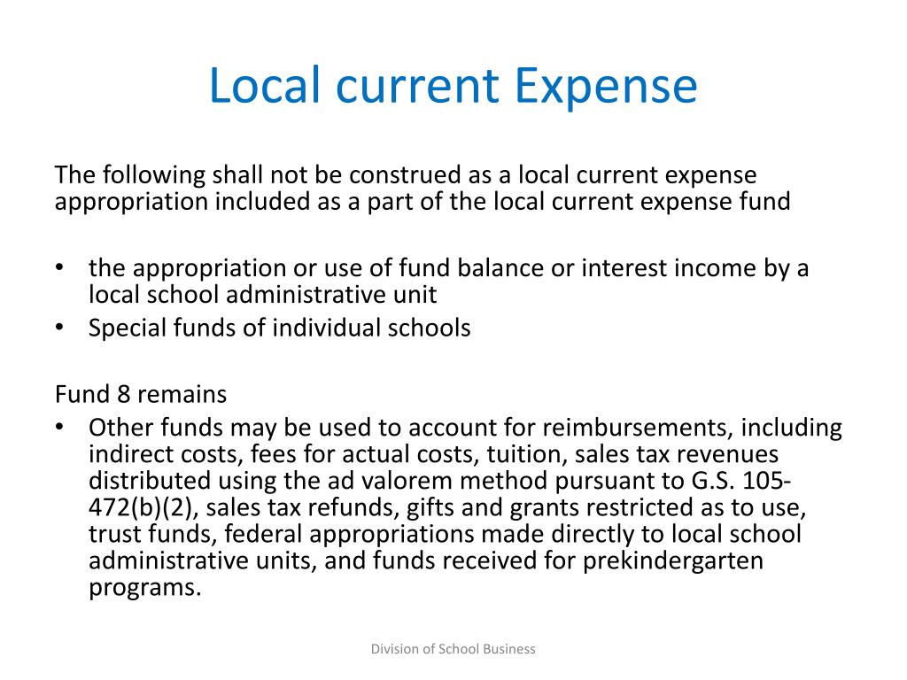 Local current Expense The following shall not be construed as a local current expense appropriation included as a part of the local current expense fund • the appropriation or use of fund balance or interest income by a local school administrative unit • Special funds of individual schools Fund 8 remains • Other funds may be used to account for reimbursements, including indirect costs, fees for actual costs, tuition, sales tax revenues distributed using the ad valorem method pursuant to G.S. 105-472(b)(2), sales tax refunds, gifts and grants restricted as to use, trust funds, federal appropriations made directly to local school administrative units, and funds received for prekindergarten programs. Division of School Business