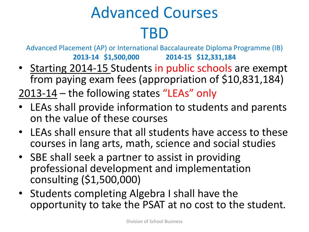 Advanced CoursesTBDAdvanced Placement (AP) or International Baccalaureate Diploma Programme (IB)2013-14 $1,500,000 2014-15 $12,331,184 • Starting 2014-15 Students in public schools are exempt from paying exam fees (appropriation of $10,831,184) 2013-14 – the following states “LEAs” only • LEAs shall provide information to students and parents on the value of these courses • LEAs shall ensure that all students have access to these courses in lang arts, math, science and social studies • SBE shall seek a partner to assist in providing professional development and implementation consulting ($1,500,000) • Students completing Algebra I shall have the opportunity to take the PSAT at no cost to the student. Division of School Business