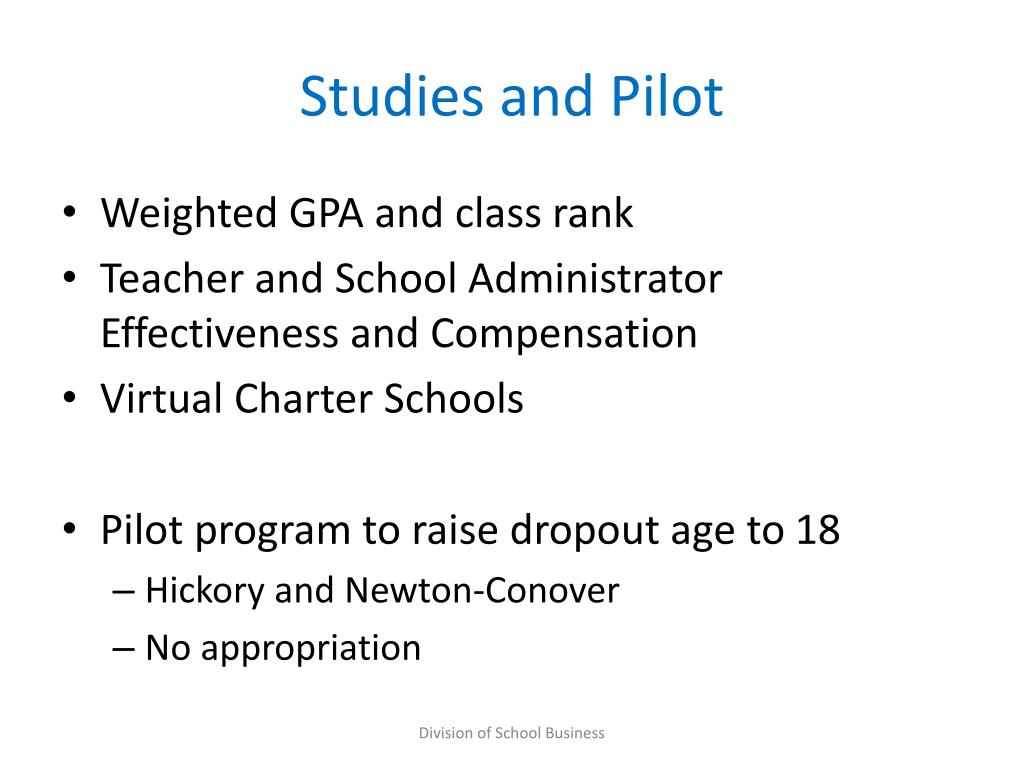 Studies and Pilot • Weighted GPA and class rank • Teacher and School Administrator Effectiveness and Compensation • Virtual Charter Schools • Pilot program to raise dropout age to 18 • Hickory and Newton-Conover • No appropriation Division of School Business