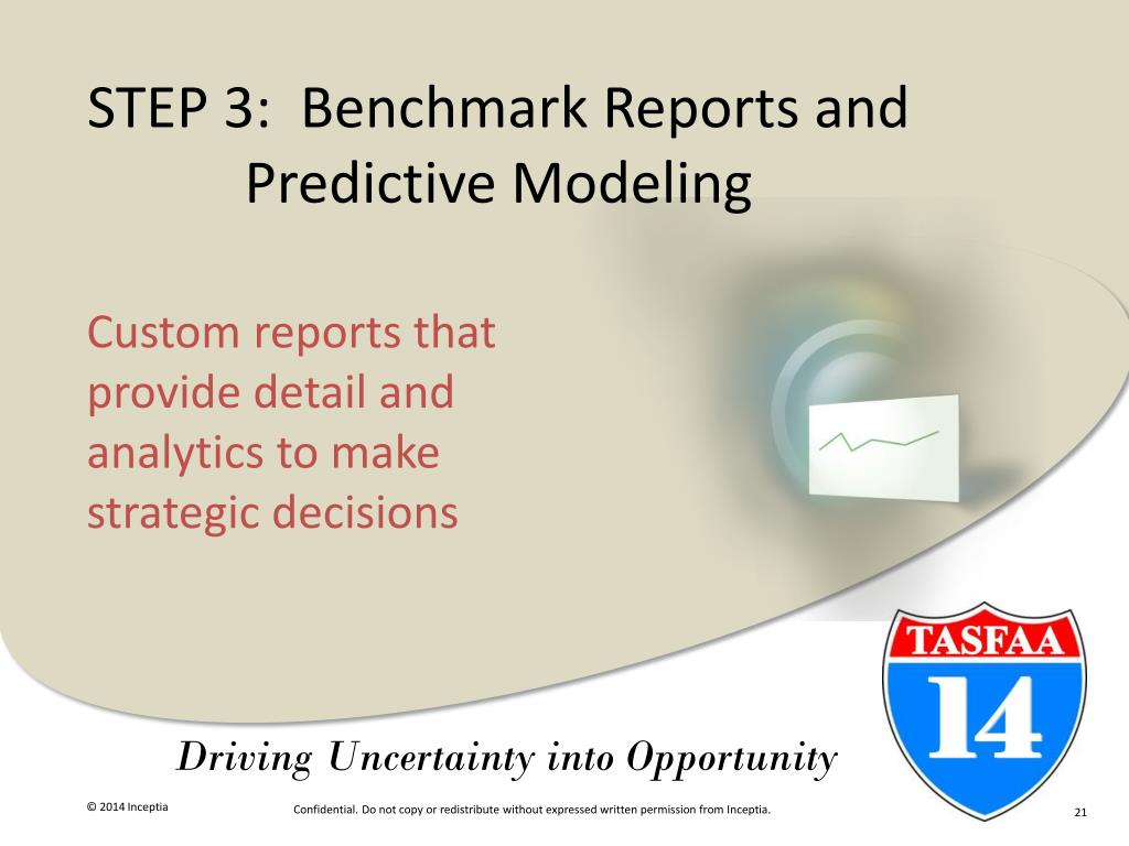 STEP 3: Benchmark Reports and Predictive Modeling Custom reports that provide detail and analytics to make strategic decisions Confidential. Do not copy or redistribute without expressed written permission from Inceptia.