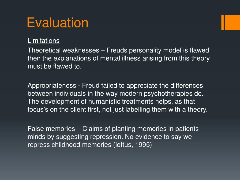 Evaluation Limitations Theoretical weaknesses – Freuds personality model is flawed then the explanations of mental illness arising from this theory must be flawed to. Appropriateness - Freud failed to appreciate the differences between individuals in the way modern psychotherapies do. The development of humanistic treatments helps, as that focus’s on the client first, not just labelling them with a theory. False memories – Claims of planting memories in patients minds by suggesting repression. No evidence to say we repress childhood memories (loftus, 1995)