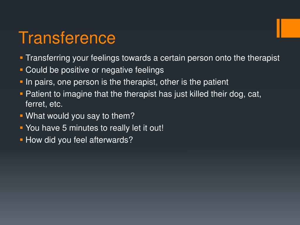 Transference • Transferring your feelings towards a certain person onto the therapist • Could be positive or negative feelings • In pairs, one person is the therapist, other is the patient • Patient to imagine that the therapist has just killed their dog, cat, ferret, etc. • What would you say to them? • You have 5 minutes to really let it out! • How did you feel afterwards?