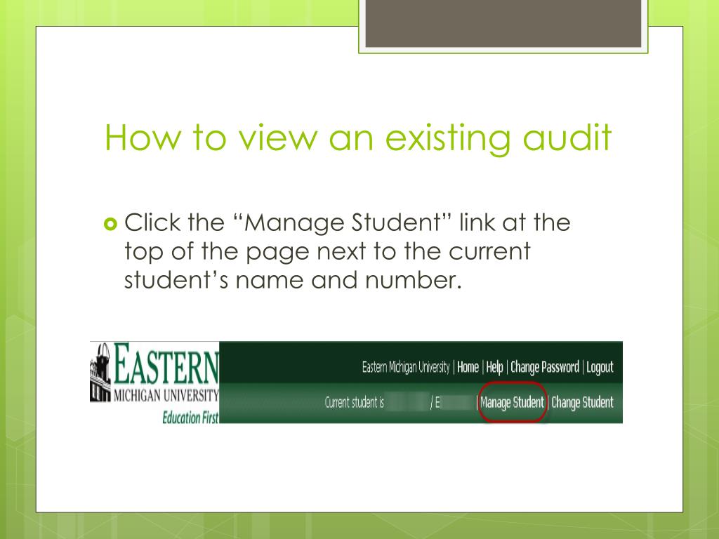 How to view an existing audit • Click the “Manage Student” link at the top of the page next to the current student’s name and number.