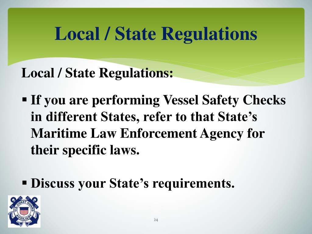 Local / State Regulations Local / State Regulations: • If you are performing Vessel Safety Checks in different States, refer to that State’s Maritime Law Enforcement Agency for their specific laws. • Discuss your State’s requirements.
