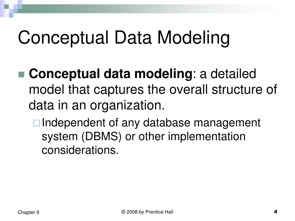 Conceptual Data Modeling • Conceptual data modeling: a detailed model that captures the overall structure of data in an organization. • Independent of any database management system (DBMS) or other implementation considerations. © 2008 by Prentice Hall