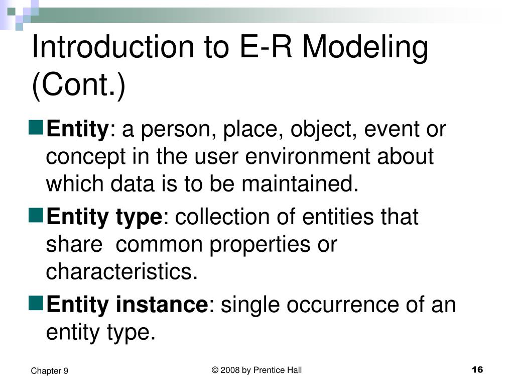 Introduction to E-R Modeling (Cont.) • Entity: a person, place, object, event or concept in the user environment about which data is to be maintained. • Entity type: collection of entities that share common properties or characteristics. • Entity instance: single occurrence of an entity type. © 2008 by Prentice Hall