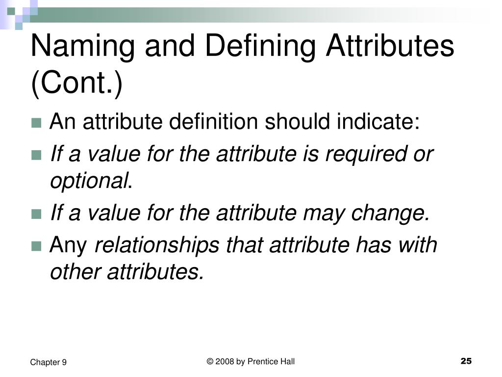 Naming and Defining Attributes (Cont.) An attribute definition should indicate: If a value for the attribute is required or optional. If a value for the attribute may change. Any relationships that attribute has with other attributes. © 2008 by Prentice Hall