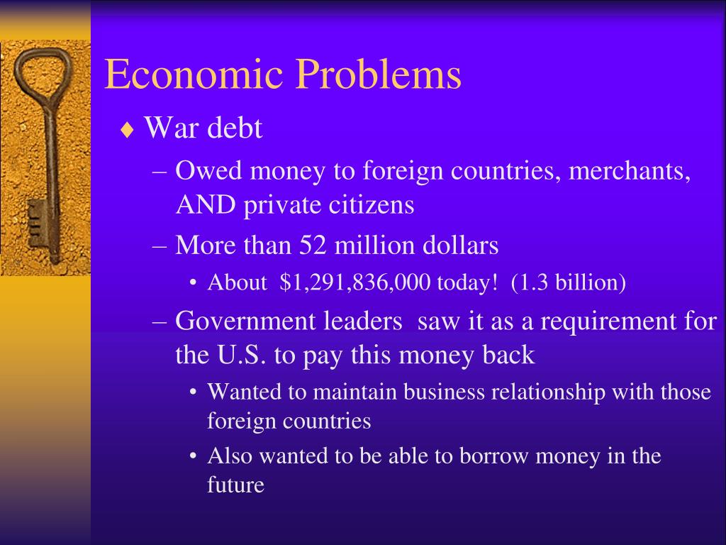 Economic Problems • War debt • Owed money to foreign countries, merchants, AND private citizens • More than 52 million dollars • About $1,291,836,000 today! (1.3 billion) • Government leaders saw it as a requirement for the U.S. to pay this money back • Wanted to maintain business relationship with those foreign countries • Also wanted to be able to borrow money in the future
