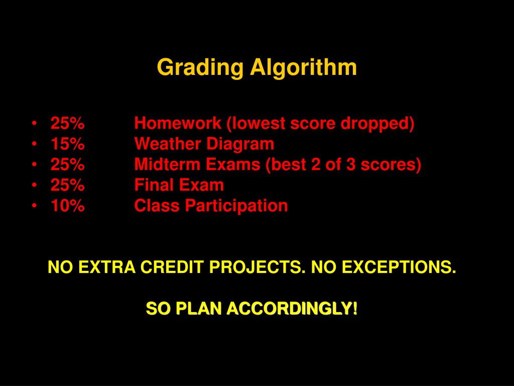 Grading Algorithm • 25% Homework (lowest score dropped) • 15% Weather Diagram • 25% Midterm Exams (best 2 of 3 scores) • 25% Final Exam • 10% Class Participation NO EXTRA CREDIT PROJECTS. NO EXCEPTIONS. SO PLAN ACCORDINGLY!