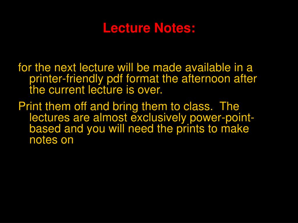 Lecture Notes: for the next lecture will be made available in a printer-friendly pdf format the afternoon after the current lecture is over. Print them off and bring them to class. The lectures are almost exclusively power-point-based and you will need the prints to make notes on