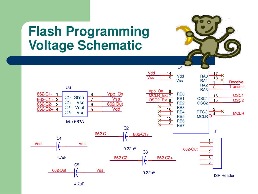 U4 Vdd 14 17 Vdd RA0 Vss 5 18 Vss RA1 Receive 1 RA2 Transmit 2 RA3 Vpp_On 6 RB0 MCLR_Ext OSC1 7 16 RB1 OSC1 OSC2_Ext 8 15 OSC2 RB2 OSC2 9 RB3 10 3 RB4 RTCC MCLR 11 4 RB5 MCLR 12 RB6 13 RB7 Flash Programming Voltage Schematic J1 1 2 662-Out 3 4 5 6 ISP Header