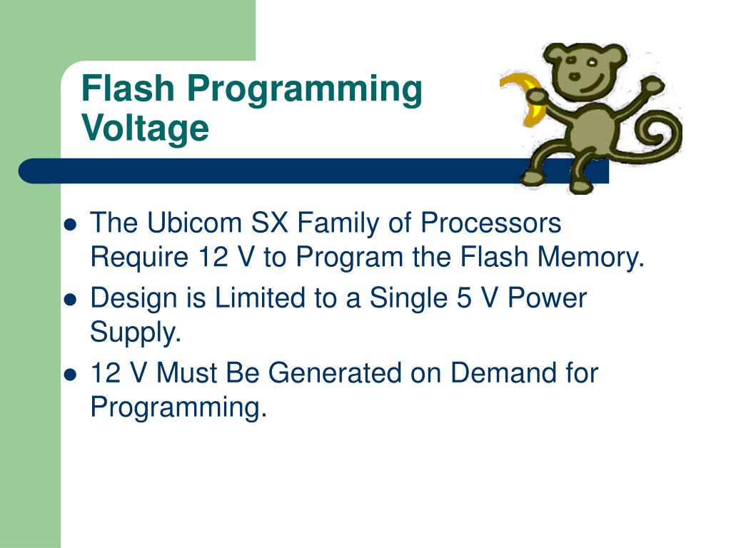 Flash Programming Voltage • The Ubicom SX Family of Processors Require 12 V to Program the Flash Memory. • Design is Limited to a Single 5 V Power Supply. • 12 V Must Be Generated on Demand for Programming.