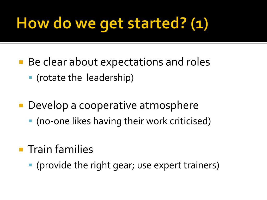 How do we get started? (1) • Be clear about expectations and roles • (rotate the leadership) • Develop a cooperative atmosphere • (no-one likes having their work criticised) • Train families • (provide the right gear; use expert trainers)