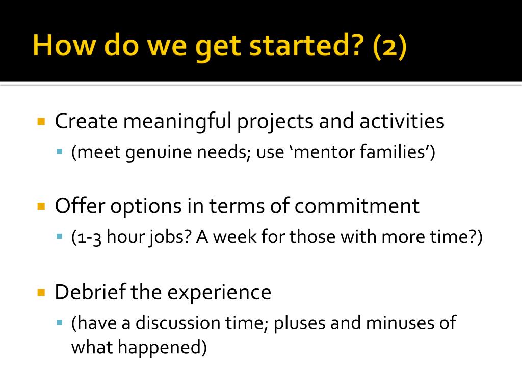 How do we get started? (2) • Create meaningful projects and activities • (meet genuine needs; use ‘mentor families’) • Offer options in terms of commitment • (1-3 hour jobs? A week for those with more time?) • Debrief the experience • (have a discussion time; pluses and minuses of what happened)