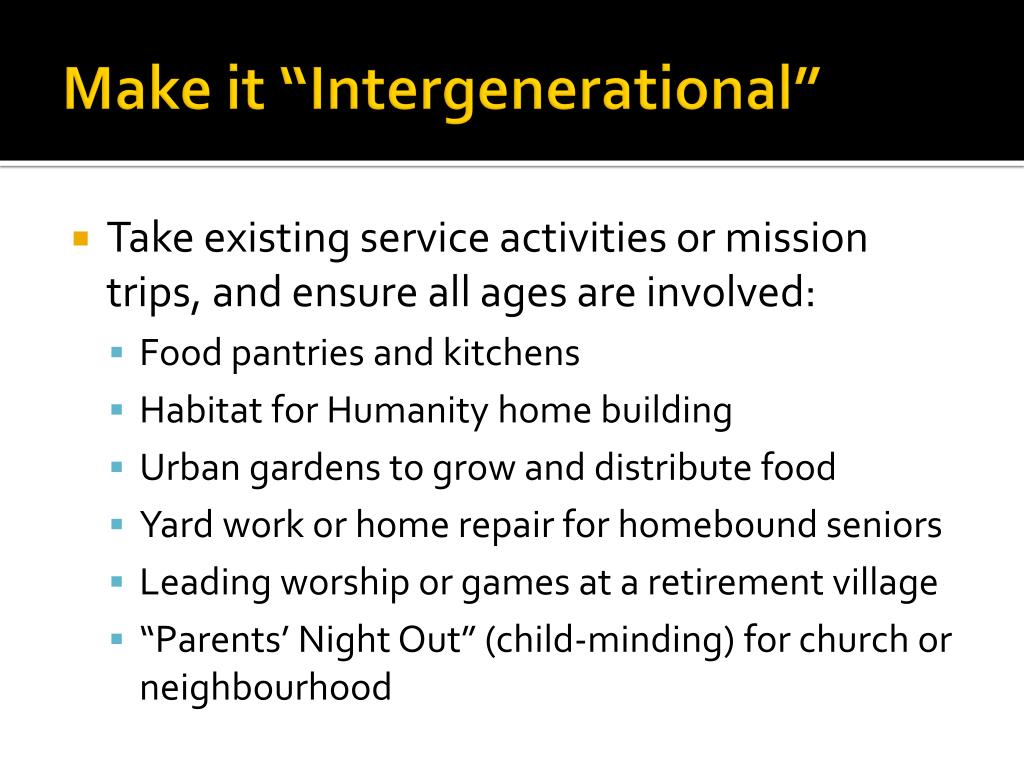 Make it “Intergenerational” • Take existing service activities or mission trips, and ensure all ages are involved: • Food pantries and kitchens • Habitat for Humanity home building • Urban gardens to grow and distribute food • Yard work or home repair for homebound seniors • Leading worship or games at a retirement village • “Parents’ Night Out” (child-minding) for church or neighbourhood