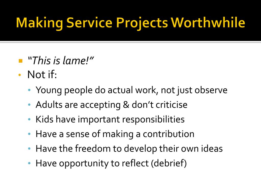 Making Service Projects Worthwhile • “This is lame!” • Not if: • Young people do actual work, not just observe • Adults are accepting & don’t criticise • Kids have important responsibilities • Have a sense of making a contribution • Have the freedom to develop their own ideas • Have opportunity to reflect (debrief)
