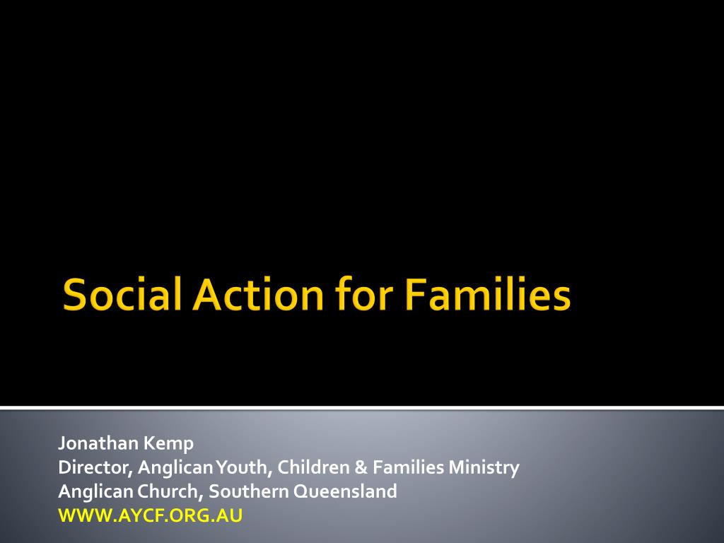 Jonathan Kemp Director, Anglican Youth, Children & Families Ministry Anglican Church, Southern Queensland WWW.AYCF.ORG.AU. Social Action for Families. Outline. What? Why? How? What Now?. What is “Social Action”?. An umbrella heading for: Social Service activities (serving others)
