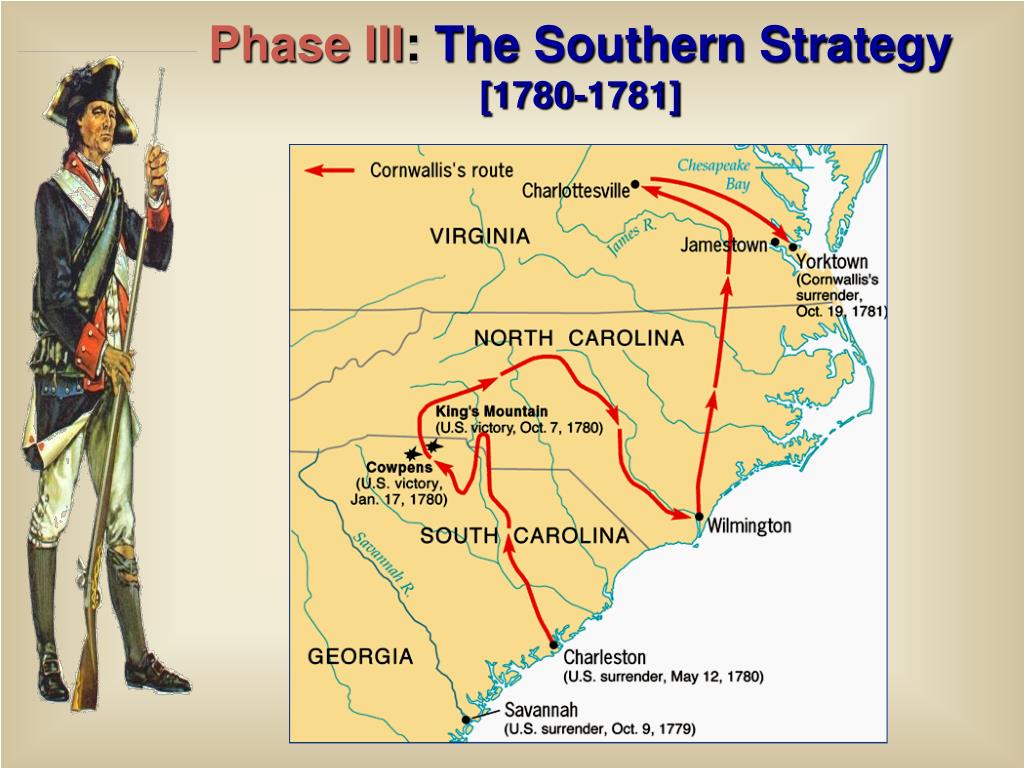 Britain’s “Southern Strategy” • Led by Cornwallis • Rally southern Loyalists • Preserve profitable colonies • Good US leaders: Nathanial Greene, Francis Marion (the Swamp Fox)