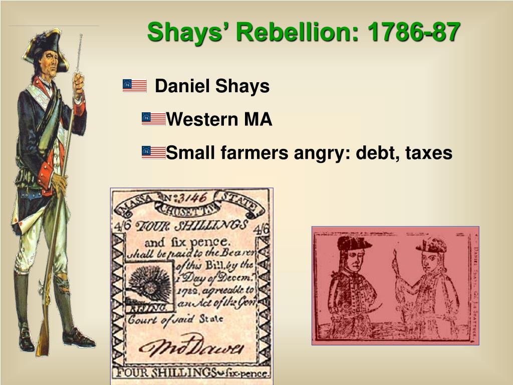 Shays’ Rebellion: 1786-87 • Daniel Shays • Western MA • Small farmers angry: debt, taxes