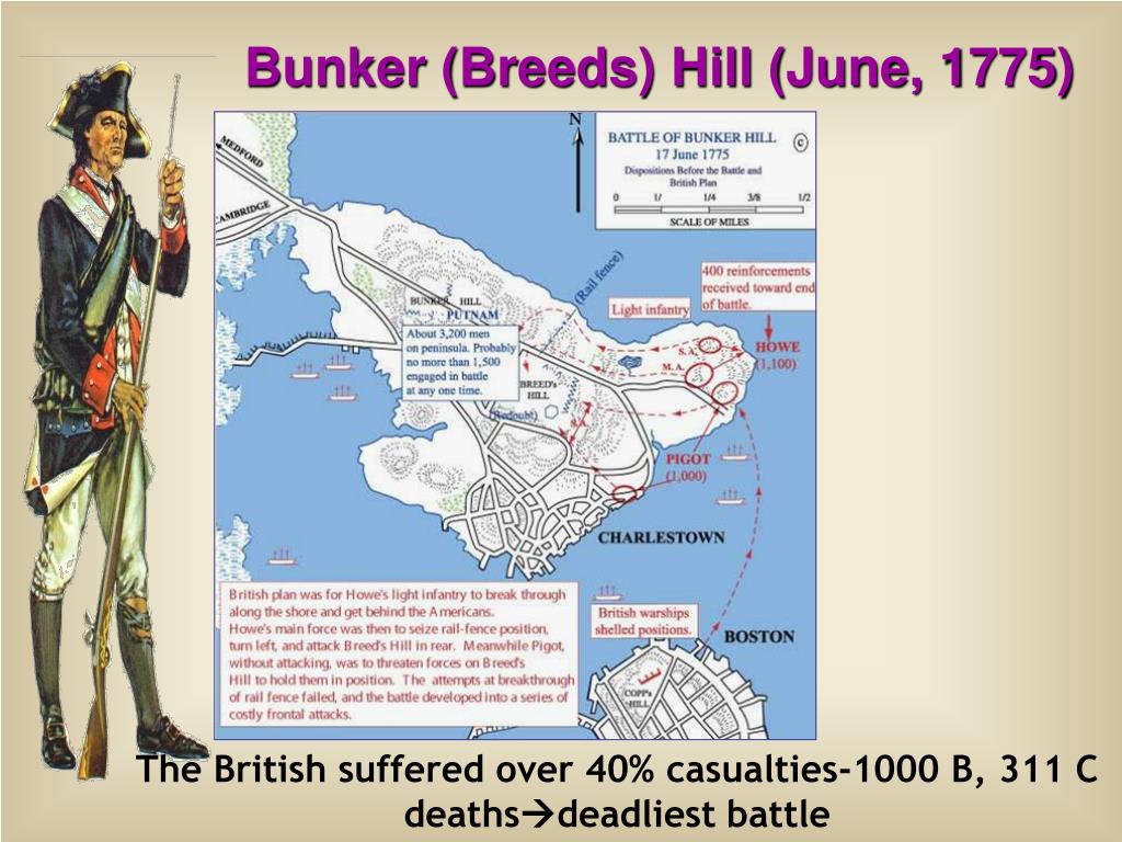 Bunker (Breeds) Hill (June, 1775) The British suffered over 40% casualties-1000 B, 311 C deathsdeadliest battle