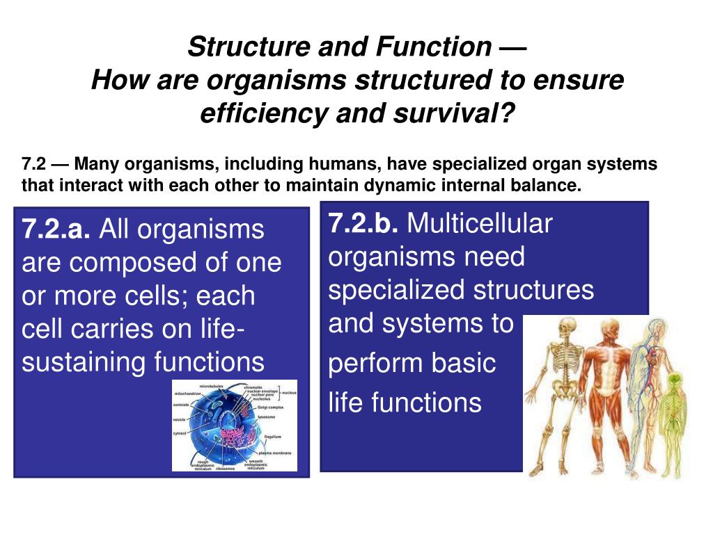Structure and Function — How are organisms structured to ensure efficiency and survival? 7.2.a. All organisms are composed of one or more cells; each cell carries on life-sustaining functions 7.2.b. Multicellular organisms need specialized structures and systems to perform basic life functions 7.2 — Many organisms, including humans, have specialized organ systems that interact with each other to maintain dynamic internal balance.