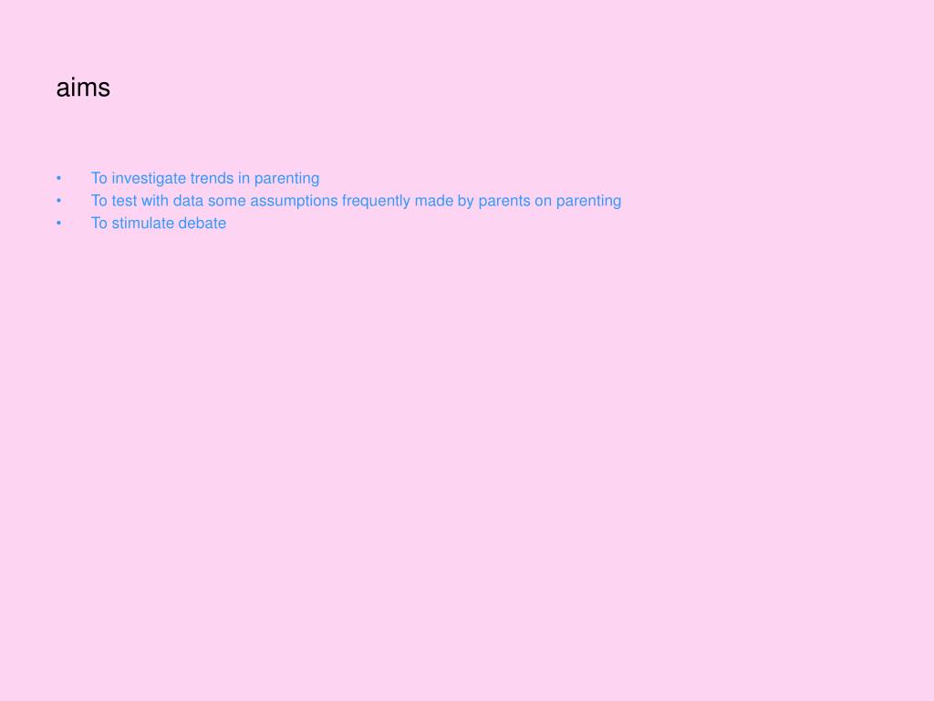 aims • To investigate trends in parenting • To test with data some assumptions frequently made by parents on parenting • To stimulate debate