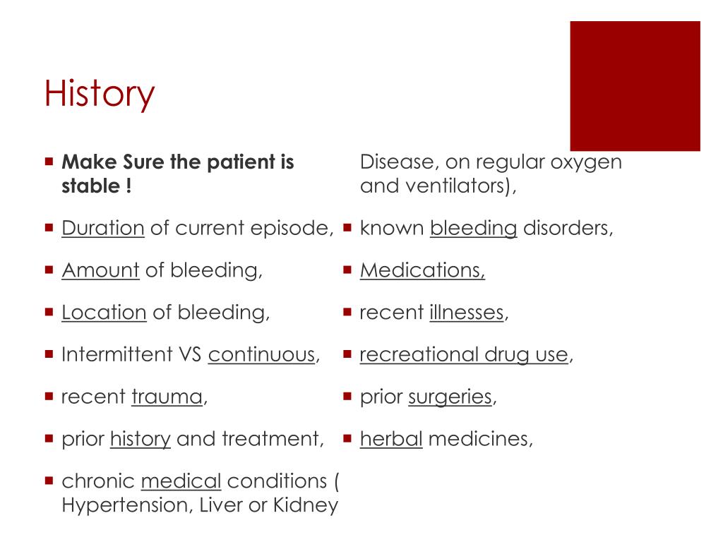 History Make Sure the patient is stable ! Durationof current episode, Amountof bleeding, Location of bleeding, Intermittent VS continuous, recent trauma, prior history and treatment, chronic medicalconditions ( Hypertension, Liver or Kidney Disease, on regular oxygen and ventilators), known bleeding disorders, Medications, recent illnesses, recreational drug use, prior surgeries, herbalmedicines,