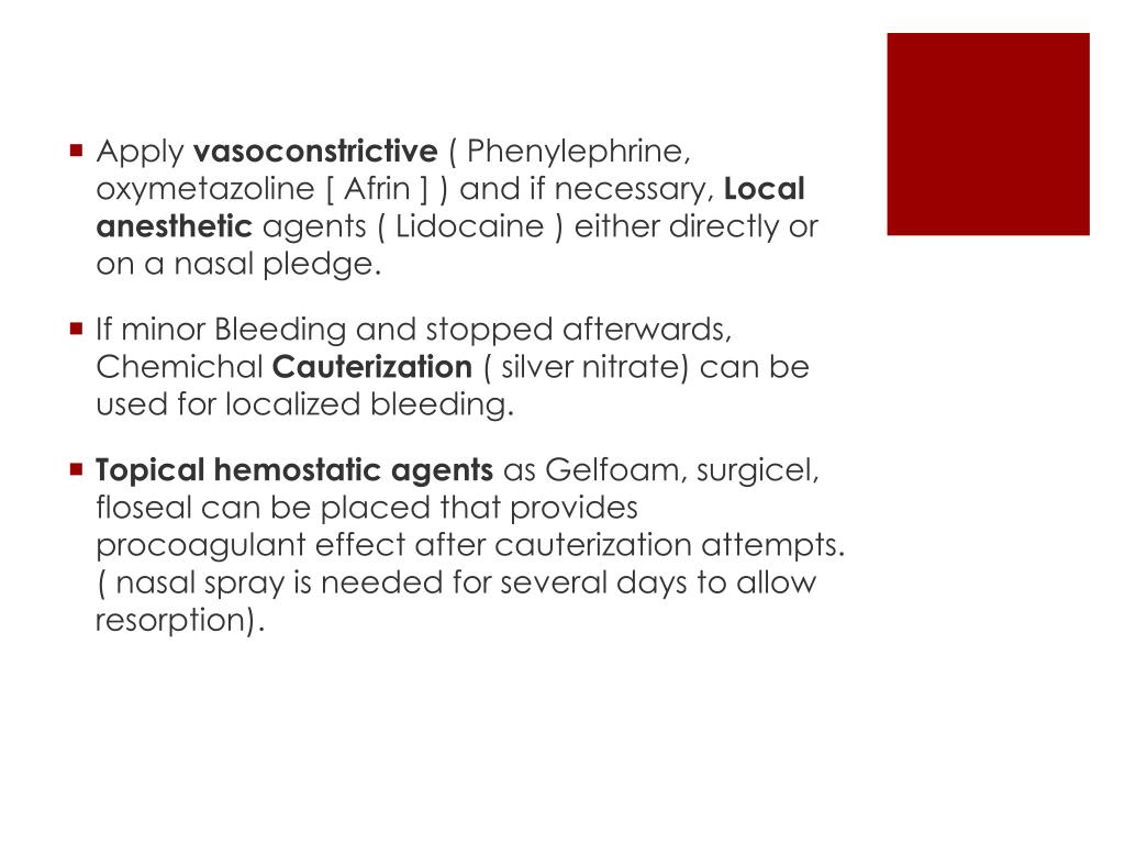Apply vasoconstrictive( Phenylephrine, oxymetazoline [ Afrin ] ) and if necessary, Local anesthetic agents ( Lidocaine ) either directly or on a nasal pledge. If minor Bleeding and stopped afterwards, ChemichalCauterization ( silver nitrate) can be used for localized bleeding. Topical hemostatic agents as Gelfoam, surgicel, floseal can be placed that provides procoagulant effect after cauterization attempts. ( nasal spray is needed for several days to allow resorption).