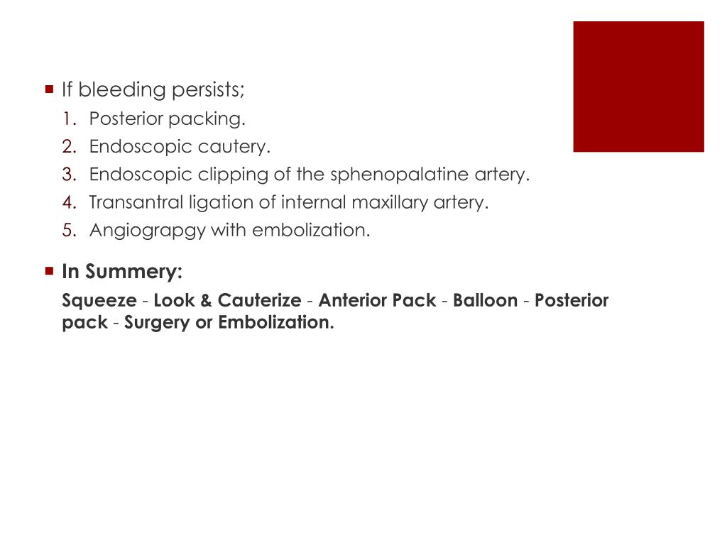 If bleeding persists; • Posterior packing. • Endoscopic cautery. • Endoscopic clipping of the sphenopalatine artery. • Transantral ligation of internal maxillary artery. • Angiograpgy with embolization. • In Summery: Squeeze - Look & Cauterize - Anterior Pack - Balloon - Posterior pack - Surgery or Embolization.